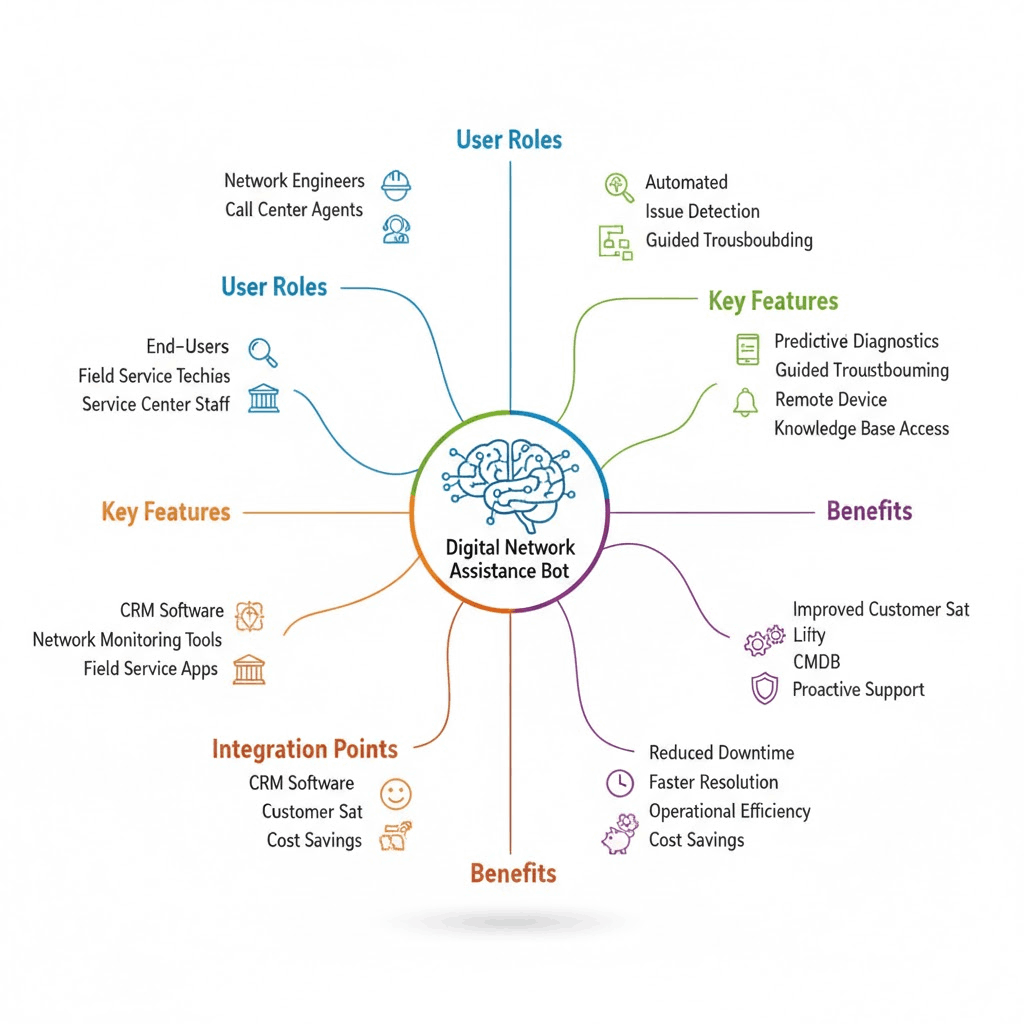 The digital network assistance experience was developed through structured brainstorming and model-mapping sessions, where I partnered with product, data, and engineering teams to evaluate intent-detection models, conversational depth, and fallback strategies. We defined an adaptive information architecture driven by user intent, confidence signals, and behavioral patterns—ensuring the AI assistant delivers the right level of guidance, personalization, and efficiency across assistance journeys.