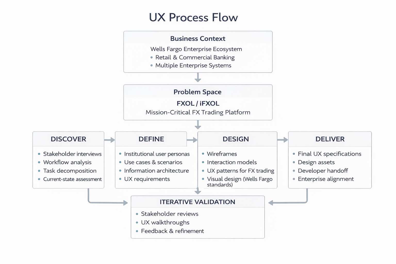 Reducing user memory loadI directly owned the application of recognition-based UX principles across FXOL / iFXOL workflows. This included simplifying screen layouts, introducing consistent labeling and grouping, and ensuring users could recognize actions and patterns across modules rather than rely on recall—significantly reducing cognitive load for high-frequency FX users.