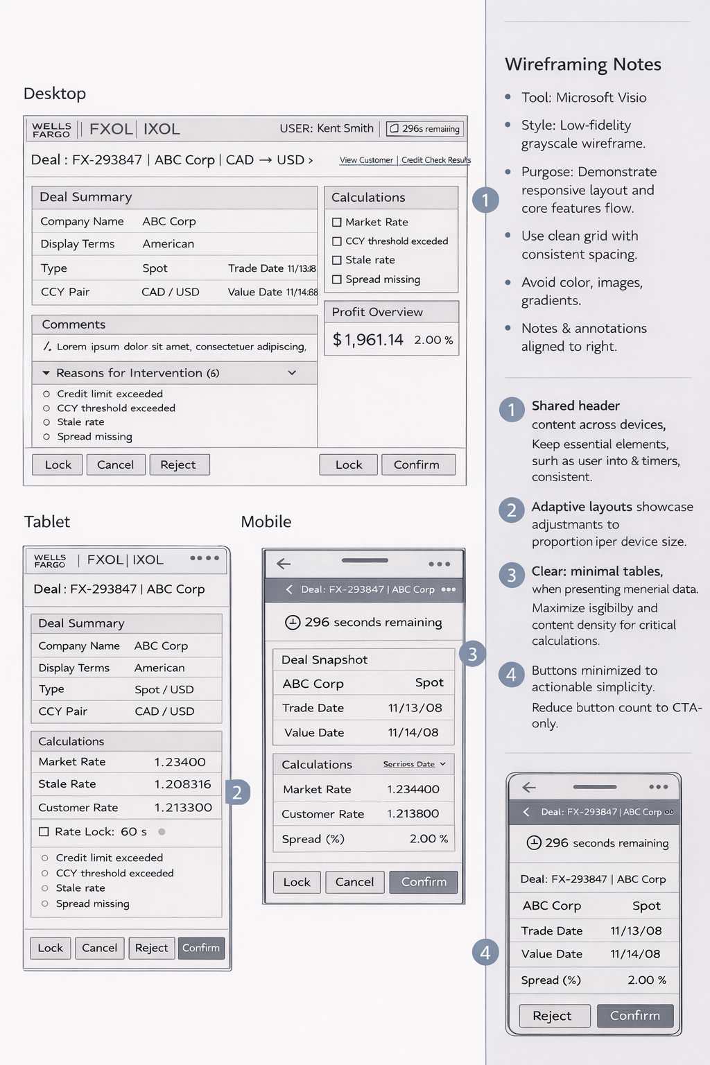 The wireframes for the iFXOL Wells Fargo application were designed to clearly articulate complex FX trading workflows across desktop, tablet, and mobile form factors. Using low-fidelity, grayscale layouts, the focus was on information hierarchy, decision-critical data, and responsive behavior rather than visual styling. Core elements such as deal details, calculations, risk indicators, and CTAs were structured on a consistent grid to ensure clarity, speed of comprehension, and usability in time-sensitive trading scenarios. The wireframes emphasize progressive disclosure, adaptive layouts, and minimal interactions to support accuracy and efficiency in a regulated enterprise environment.