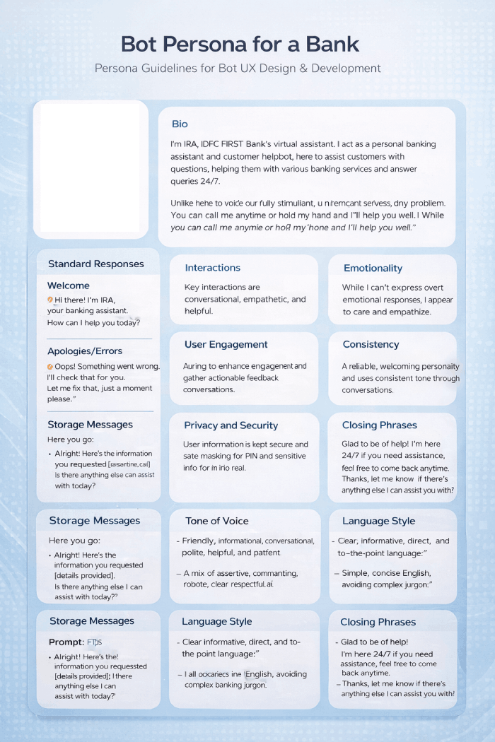 To support predictability, we standardized intents, responses, confirmations, and fallback patterns across IRA workflows, enabling consistent behavior and reliable mental models. Transparency was built in through clear system signaling and plain-language explanations of actions and outcomes.
