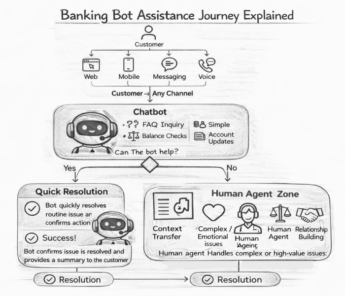 At its core, the framework defined common conversation patterns, including dialog structure, turn management, confirmations, error recovery, and escalation. A unified, function-aligned intent taxonomy ensured predictable behavior, enabled analytics, and reduced duplication across teams. For regulated workflows, the framework enforced progressive disclosure and explicit validation, balancing usability with compliance and risk management. Explainability and audit readiness were embedded through transparent system responses and traceable conversation logs. Standardized fallback and human-handoff patterns ensured seamless continuity when automation thresholds were reached.