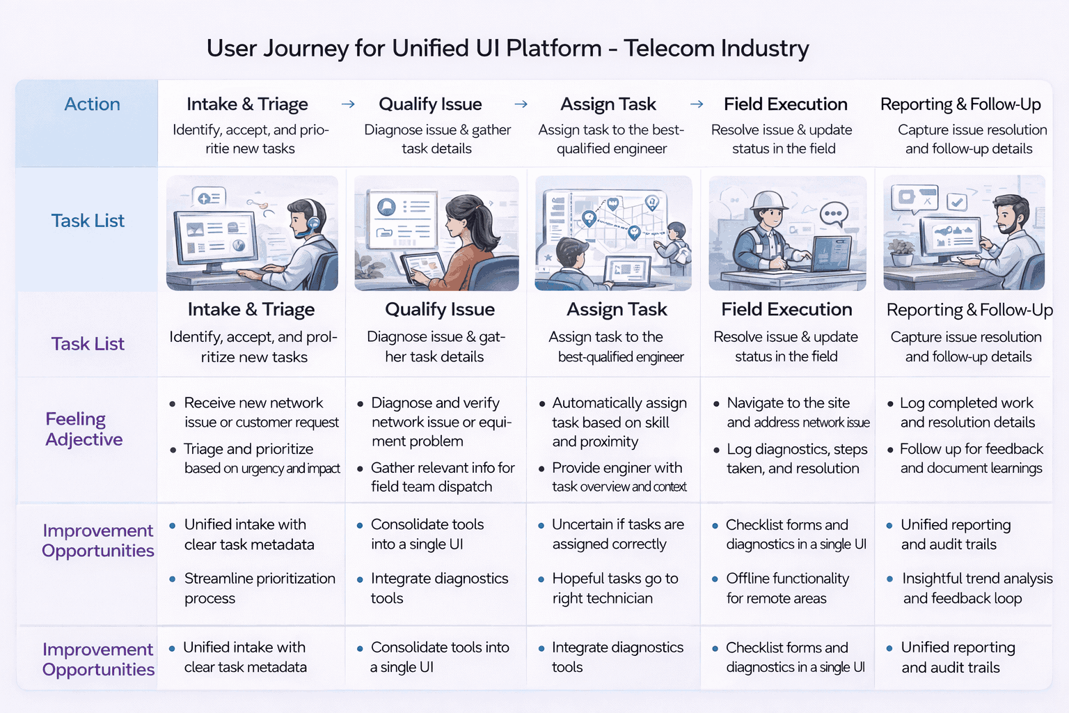 The Unified User Interface (UUI) was a large-scale enterprise UX transformation for a telecom organization operating on more than 50 years of legacy systems. Over decades, internal tools had been built in silos—each optimized for a specific function, system, or vendor—resulting in a fragmented experience that traded time and productivity for task completion.